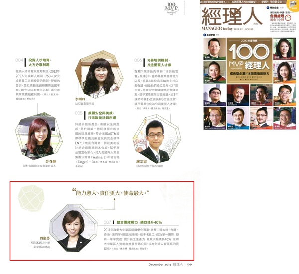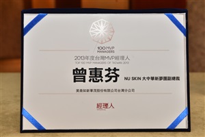 ®¥¶P¡INU SKIN ¦p·s¤j¤¤µØ·s¹Ú¹Î°ÆÁ`µô´¿´fªâÀò¥xÆW¡m¸g²z¤H¤ë¥Z¡nµû¿ï¬°¡u2013 100 MVP¸g²z¤H¡v¡A¨Ã¥H±À°ÊNU SKIN ¤j¤¤µØ²Õ´¾ã¦Xªº¨ô¶Vªí²{¡A¦b¡u²Õ´³Ð·s¡v¶µ¥Ø¤W²æ¿o¦Ó¥X¡C¹{¼ú¨å§©ó12¤ë4¤é¦b¥x¥_Á|¦æ¡A¨Ã¥Ñ¥xÆW¸gÀÙ³¡¦¸ªø¨ô¤h¬L¹{¤©¼úª¬¡AªÖ©w¨ä°^Äm¡ANU SKIN ¤j¤¤µØ·s¹Ú¹Î°ÆÁ`µô´¿´fªâµoªí±o¼ú·P¨¥®É¡A§ó¥H¡u¯à¤O·U¤j¡B³d¥ô§ó¤j¡B¨Ï©R³Ì¤j¡v»P©Ò¦³»P·|ªº±M·~¸g²z¤H¦@«j¤§¡C