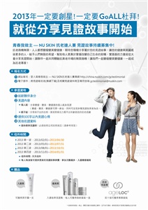 In order to celebrate the coming 30th anniversary, NU SKIN has been holding an online campaign themed ¡uHappy NU Year Welcoming 30¡vfrom December 16,2013 to February 10,2014. In the first phase, NU Dream will look for the greatest dreamer. So far, we have received over 2,000 dreams online!! NU SKIN invites you to take the opportunity, write down the most creative and achievable dreams, and meet the better you in 2014! In the second phase, we will vote and choose the best NU Look photo, which should include the NU SKIN logo on the 101 Tower and you. The photo receiving the most votes online will win the ageLOC® package. All the participants will have the chance to win NU SKIN classic products! (For more information, please click here to visit the activity webpage)
