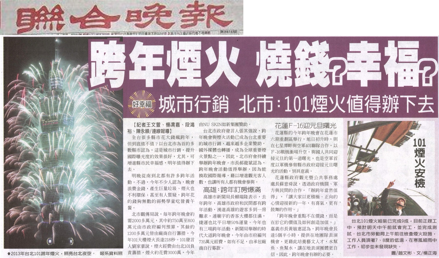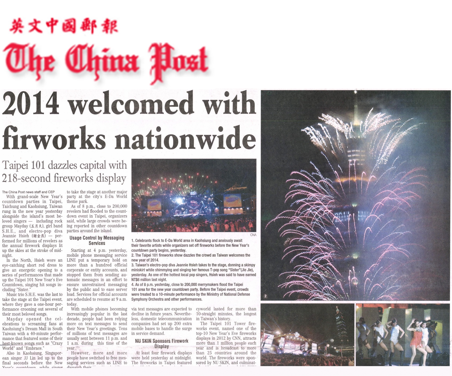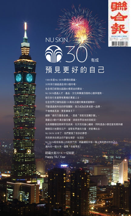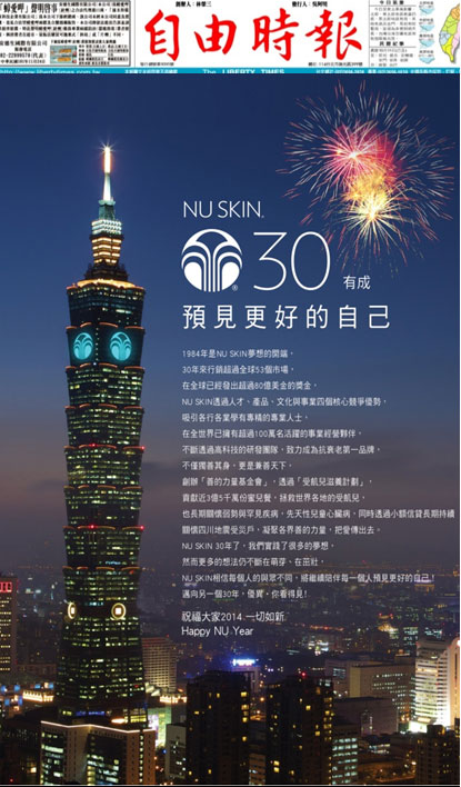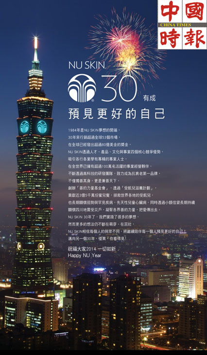 2014 witnessed NU SKIN creating history. It is the first time NU SKIN cooperated with Taipei 101 Tower, the tallest green building in the world, showing its logo on the tower during December 23, 2013 and January 8, 2014, to celebrate NU SKIN’s success.