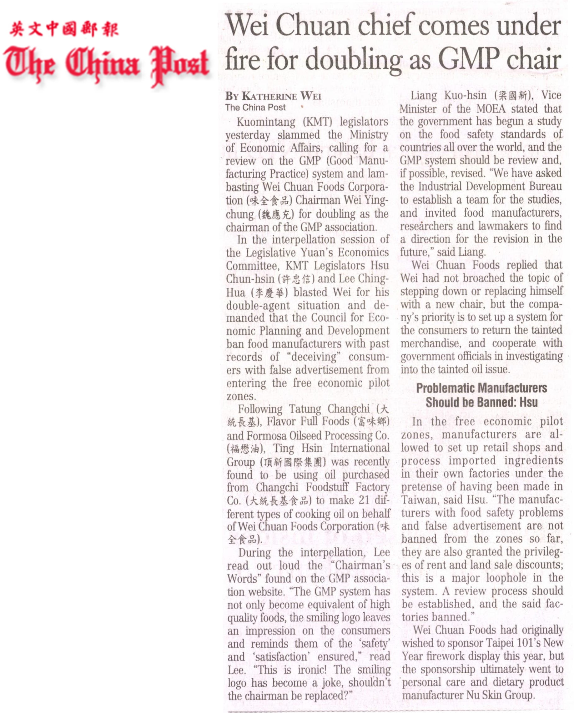 Wei Chuan chief comes under fire for doubing as GMP chair |