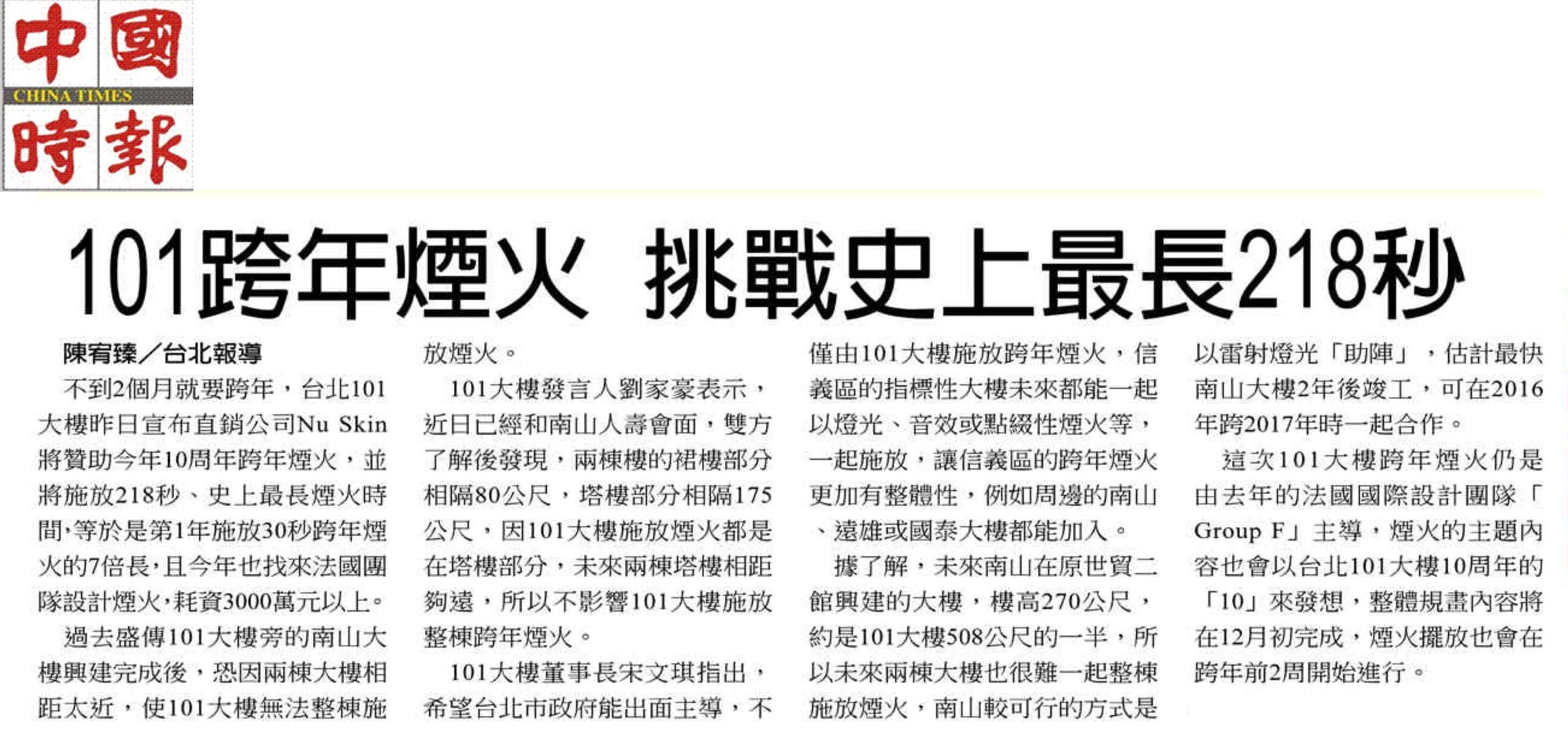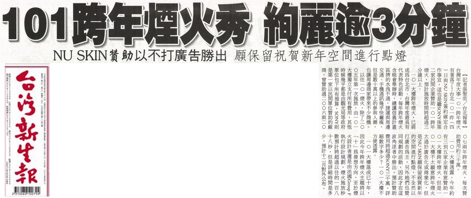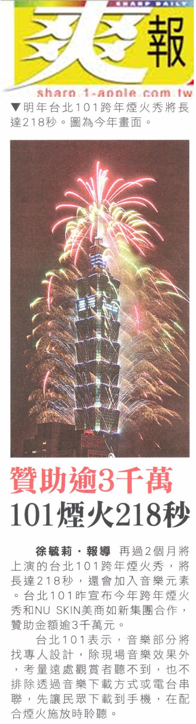 101跨年煙火 規劃施放218秒--十全十全呈現 美商Nu SKIN如新集團贊助 金額可能超過三千萬 |