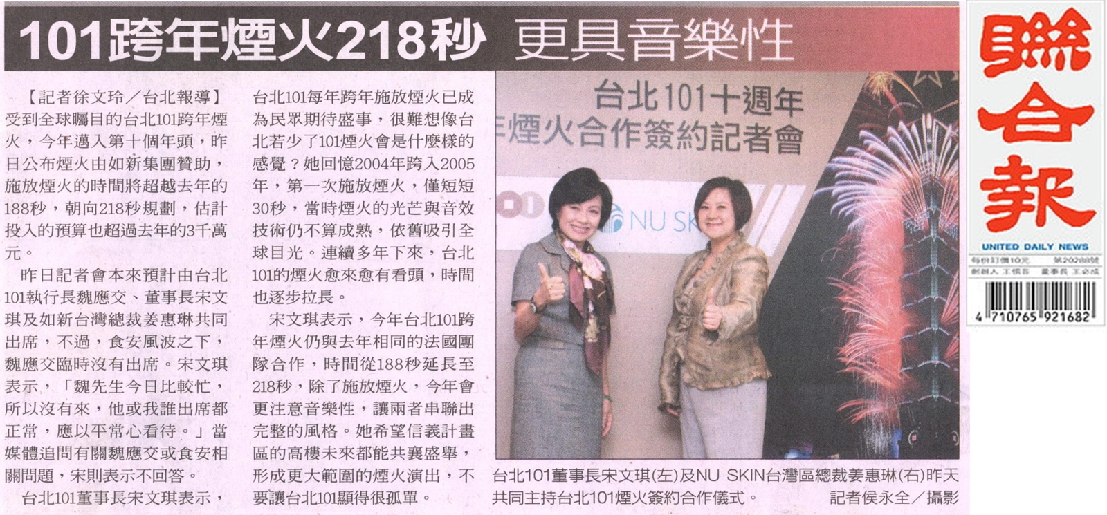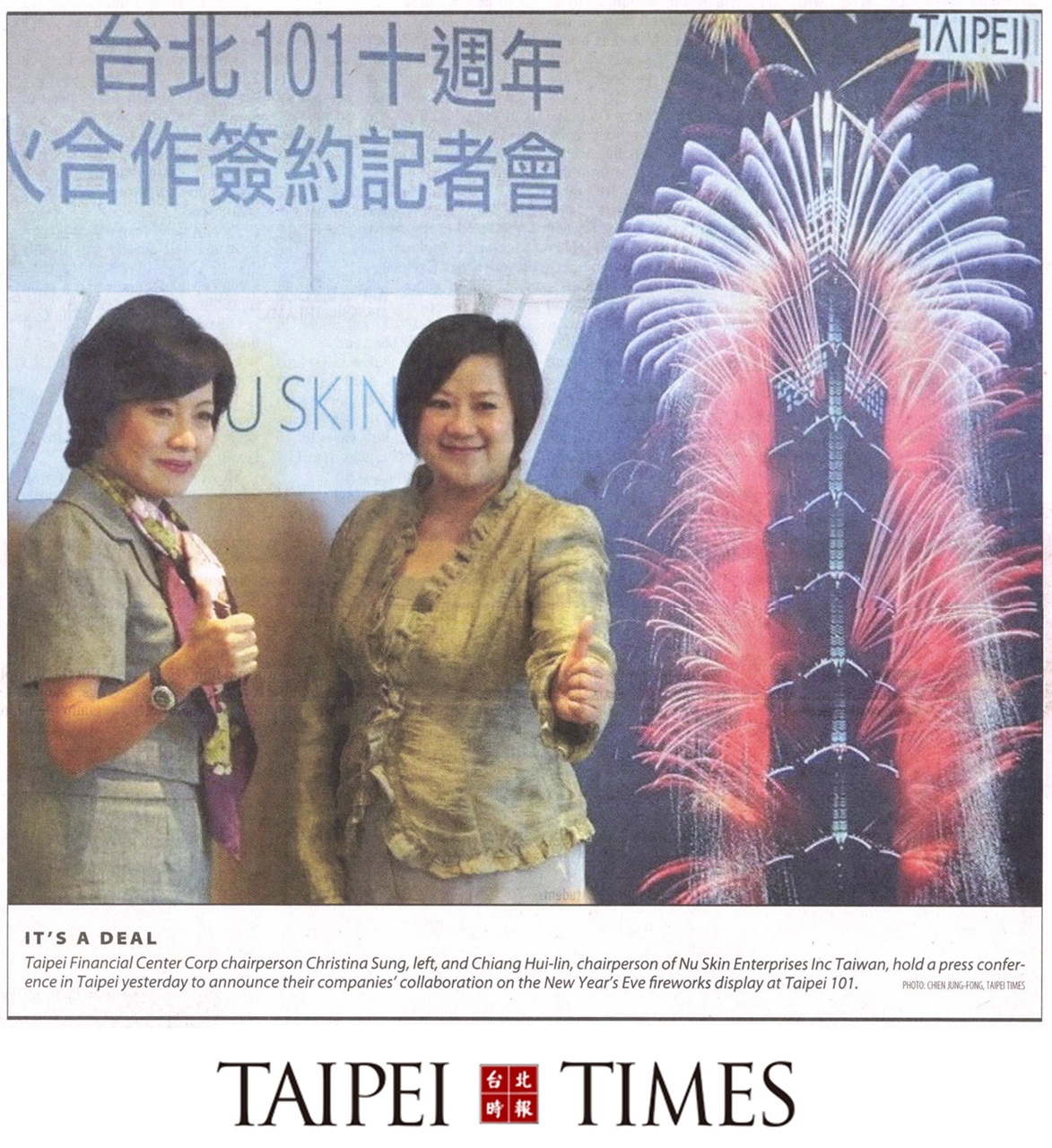 11月4日在台北101摩天大樓舉行的跨年煙火合作簽約記者會,由台北101董事長宋文琪與 NU SKIN 如新大中華商機事務區域副總裁暨臺灣總裁姜惠琳 (Charlene) 進行簽約儀式,總計吸引75位媒體記者出席,短短24小時內創造超過100則的新聞報導,NU SKIN 與您分享精采的活動現場照片與新聞回顧: