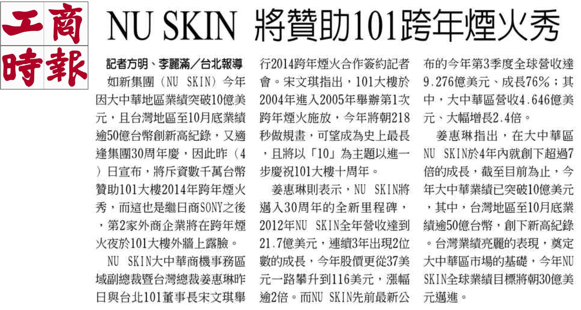 2014將是 NU SKIN 如新的「創歷史」年,為迎接即將到來的30周年慶,NU SKIN 首度與全球第1高的綠化建築「台北101摩天大樓」攜手合作,曾被CNN評選為全球10大跨年景點的台北101煙火秀,不僅是台灣的年度盛事,更是世界矚目的焦點。2012 NU SKIN 全年營收達到21.7億美元,突破連續3年雙位數的成長,今年的股價從37美元一路攀升到116美元 , 成長高達213% , 截至目前為止,今年大中華區業績已經突破10億美元,4年內就創下超過7倍的成長,目標成長2倍以上,展望 NU SKIN 全球目標朝向30億美元邁進。NU SKIN 在20年前選擇台灣作為第2個海外市場, NU SKIN 台灣穩健的成長,不但奠定大中華區市場的基礎,在全球53個海外市場中,也是最成功的市場之一,NU SKIN 很榮幸與台北101攜手,在2014年以萬馬奔騰的躍起之勢,讓世界看見 NU SKIN 的璀璨新頁!