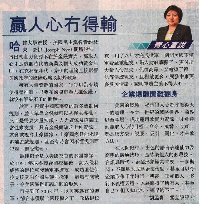 《“中國提升軟實力有兩大包袱” 軟實力之父獻計 粗溫和外交》 |