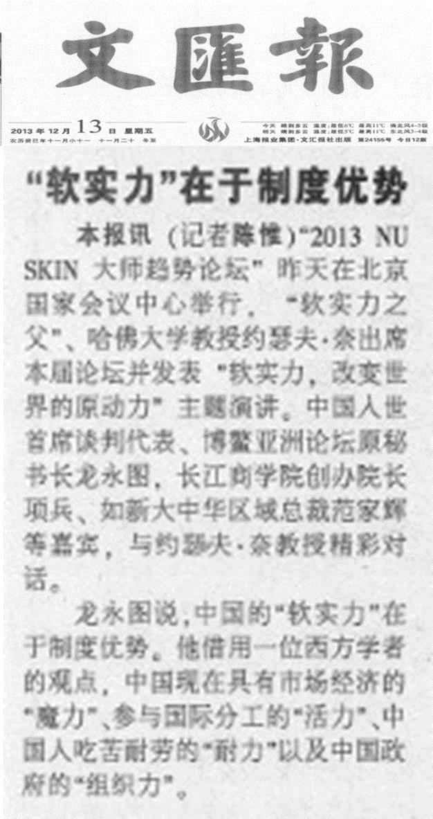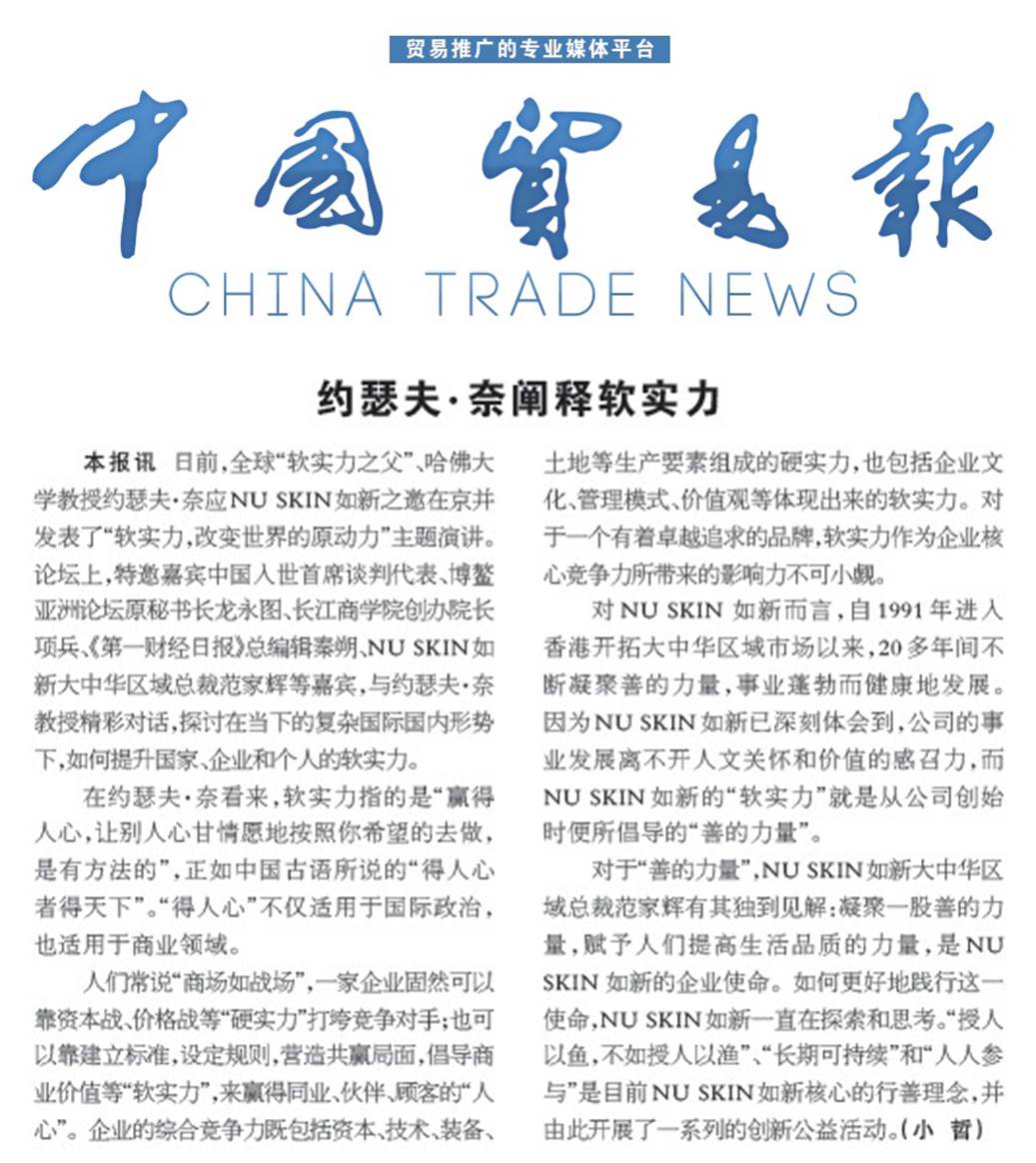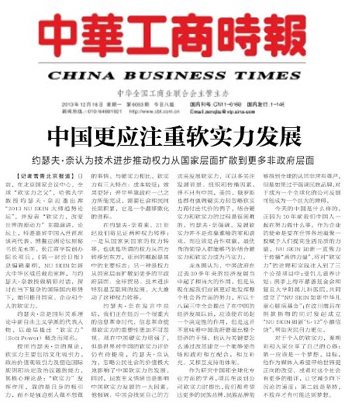 2013年12月8日,隨著軟實力之父,哈佛大學教授約瑟夫•奈伊的空降大中華,2013年NU SKIN 大師趨勢論壇正式拉開序幕。作為這次盛會的主講嘉賓,大師約瑟夫•奈伊的一舉一動都牽動著兩岸三地的強烈關注。約瑟夫•奈伊以「軟實力,改變世界的原動力」為題和香港、台北、北京的政、商、學、媒屆嘉賓共同探討了當前的國際國內局勢,並且向在座的每一位來賓授之以漁—如何充分發揮個人軟實力給予寶貴建議,與此同時大師還肯定了 NU SKIN 創新力和「善的力量」是軟實力之最佳印證。